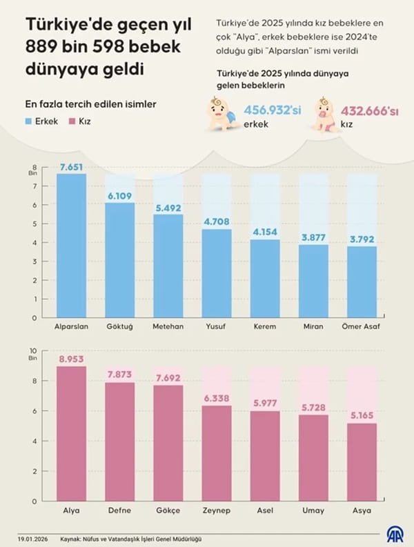 Geçtiğimiz yıl kız bebeklerde zirvede yer alan Defne ismi, bu yıl yerini Alya’ya bıraktı. Toplam 889 bin 598 bebeğin dünyaya geldiği 2025’te, Alya ismi kısa sürede listenin ilk sırasına yerleşti. Uzak Şehir dizisiyle birlikte Alya, 2025’in sadece ekranlarda değil, nüfus kayıtlarında da en çok iz bırakan isimlerinden biri olarak öne çıktı.