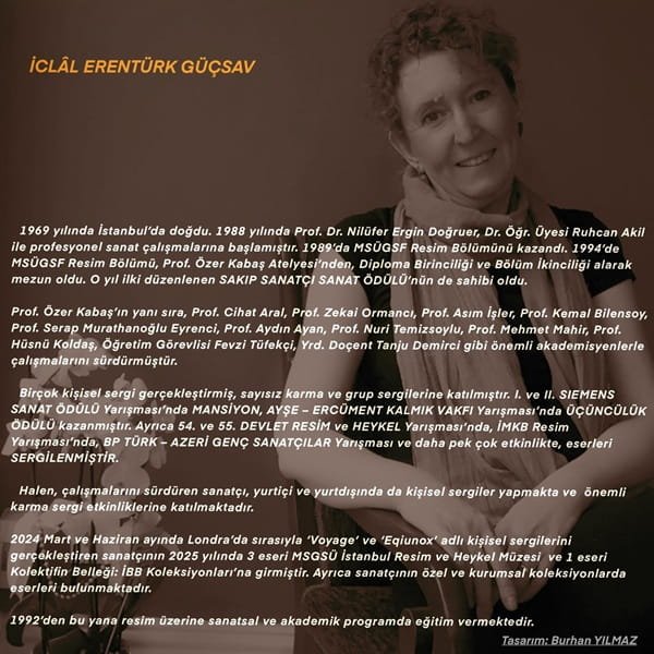 Sanatçı İclal Erentürk Güçsav ise “Derinlik”te, içsel bir araştırma alanını başkalarıyla kurulan ilişkiler üzerinden genişlettiğini ifade ediyor. Kendi deneyimlerinden yola çıkan sanatçı, özellikle yakın dönemde yaşadığı kaybın etkisiyle, zamanın parçalı yapısını ve duyguların iç içe geçme hâlini resimlerinde görünür kıldığını belirtiyor. Bu sergiyle birlikte kişisel bir yasın, ortak bir hafıza ve duygudaşlık alanına dönüşebileceğine işaret eden Güçsav, çalışmalarını merhum babası İç Mimar Cemil Aytaç Erentürk’ün anısına ithaf ediyor.
